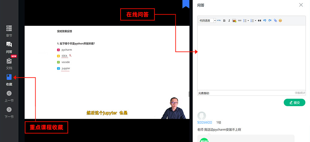 专业老师在线答疑,实时解决代码问题,让自学者告别'卡壳''学不进去''太难丧失信心'的心态问题,提高学习效率。